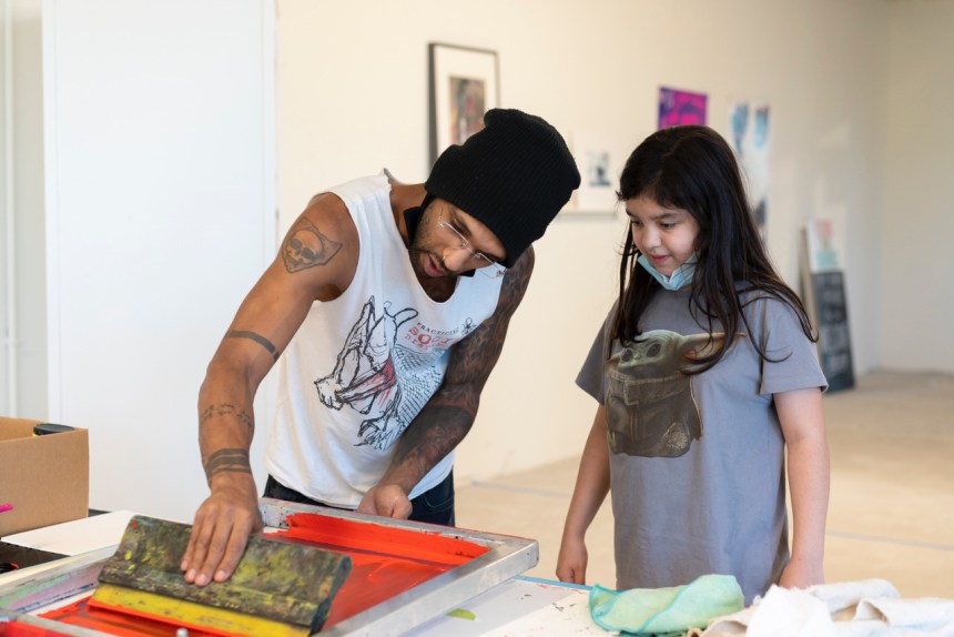 Images of Future Ink Graphic’s silkscreen printing event at the Young Latino Network’s pre-show Mixer at the Pivot Art Center on October 1, 2021.