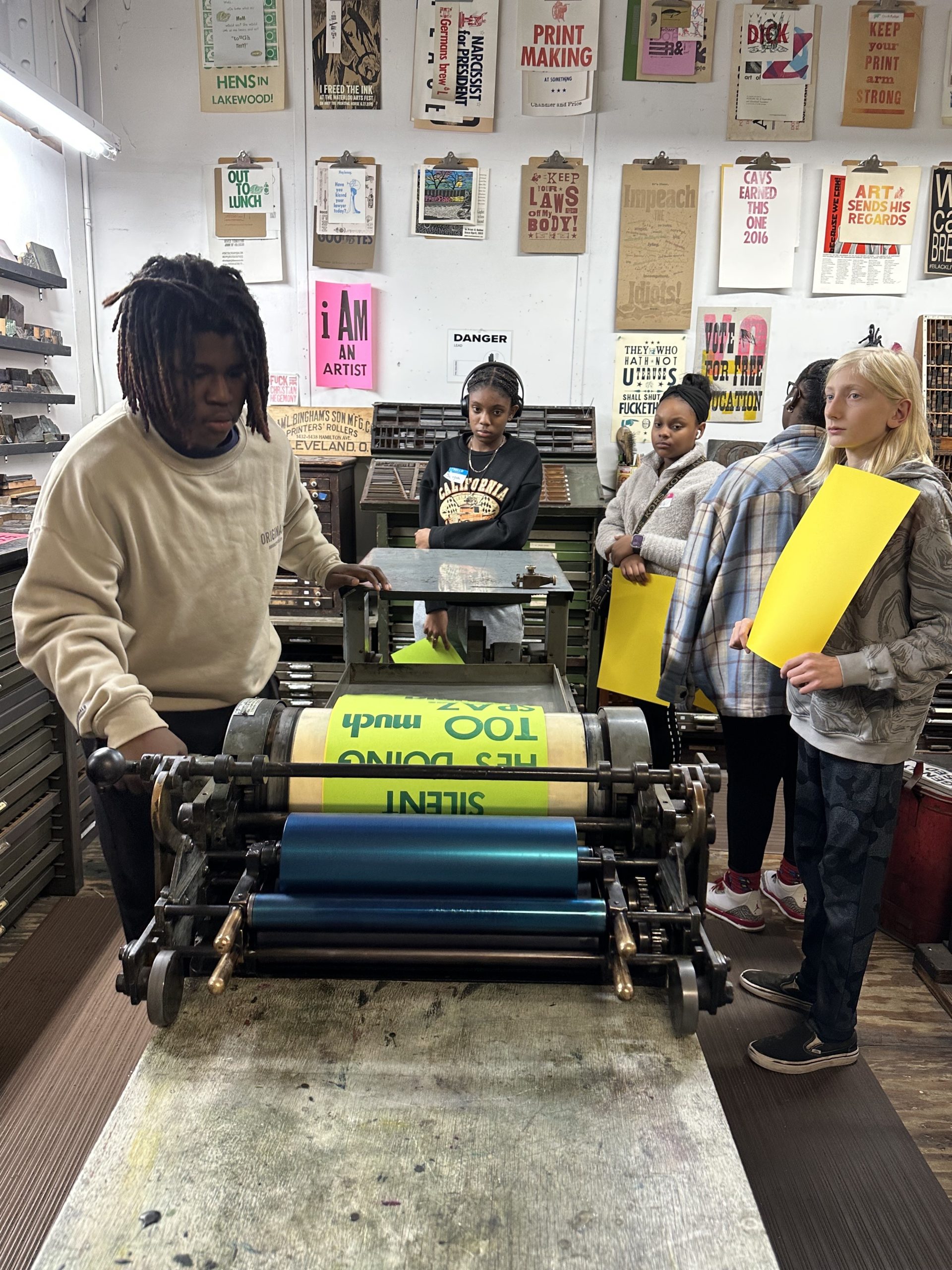 Inexpensive and easy to disseminate, prints have been made on paper and other materials for over 1000 years. The invention of the printing press around 1440 arguably marked the start of modern mechanical reproduction, and initiated what is often regarded as the Printing Revolution. Since that time, prints have occupied a crucial place in visual and material culture—serving as entertainment, as propaganda, as provocation, and as inspiration. Printmaking can be a creative mode of political and social expression, and also has been instrumental in implicitly and explicitly shaping public discourses around race and identity. When I founded Pressing Matters in 2022, my aim was to bring that history to life for young Clevelanders through the experiential practice of printmaking. In turn, I joined with Jackie Feldman, executive director, and Brittany Hudak, senior program manager, at Zygote Press. With the generous support of an Expanding Horizons Initiative Grant from Case Western Reserve University (CWRU), we began to envision a teen program to be launched during summer 2022. Under my supervision, art history students at CWRU worked collaboratively with Feldman and Hudak to build a curriculum that would at once teach basic principles of humanistic inquiry—critical thinking and looking skills, for example—and would harness the potential of art as a means of self-advocacy. An MA student in the course, Sarah Lavin, remarked that “I was not only able to learn about the history of printmaking and its societal importance, but had the opportunity to put what I learned into practice in the real world. I was able to see how art history can be used in a public, community-driven way and maintain its relevance to non-art historians.”